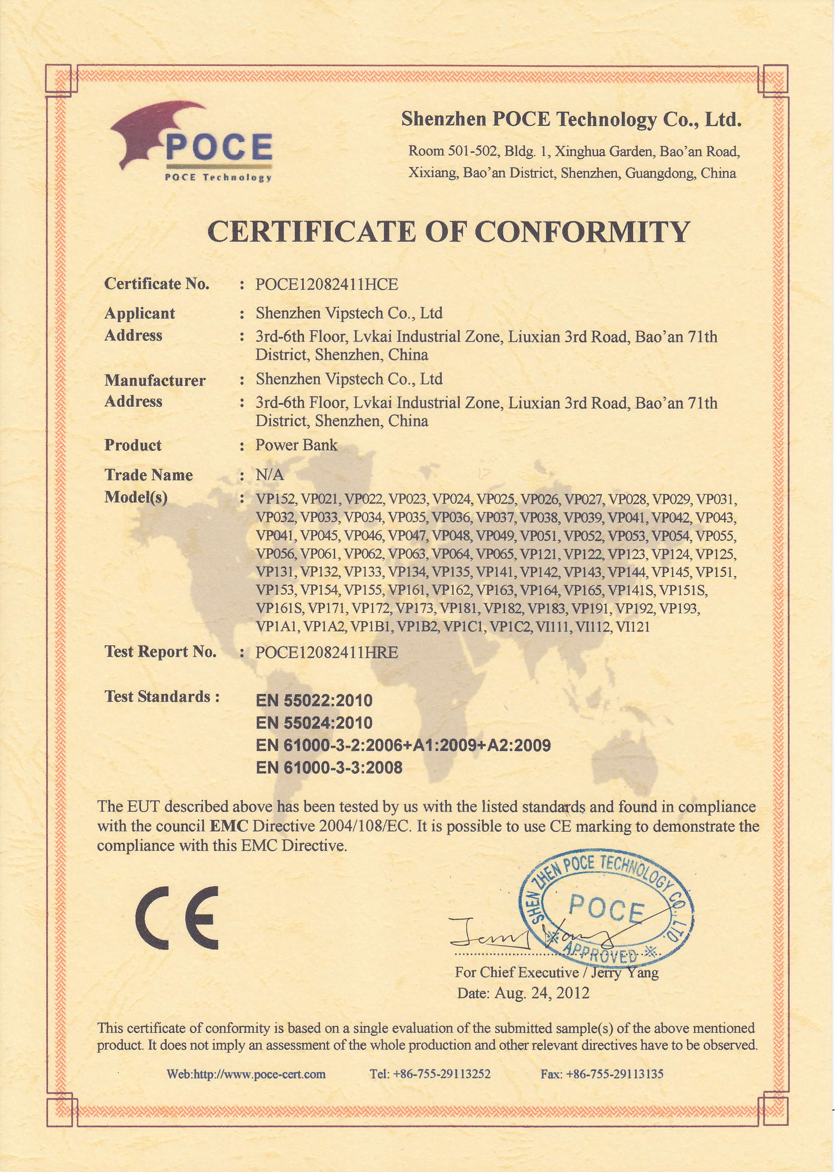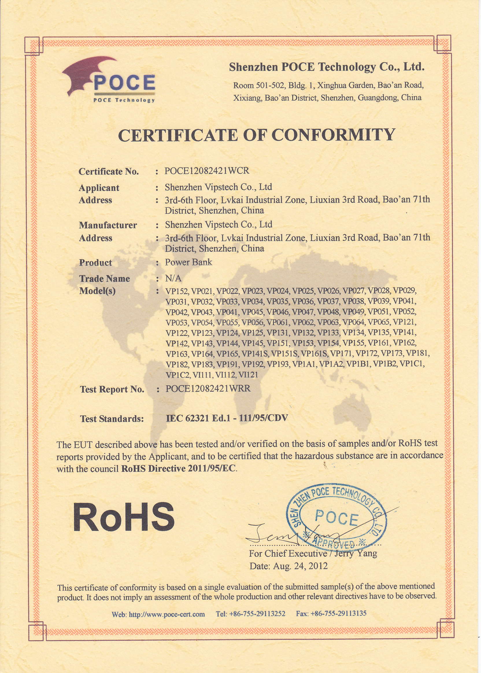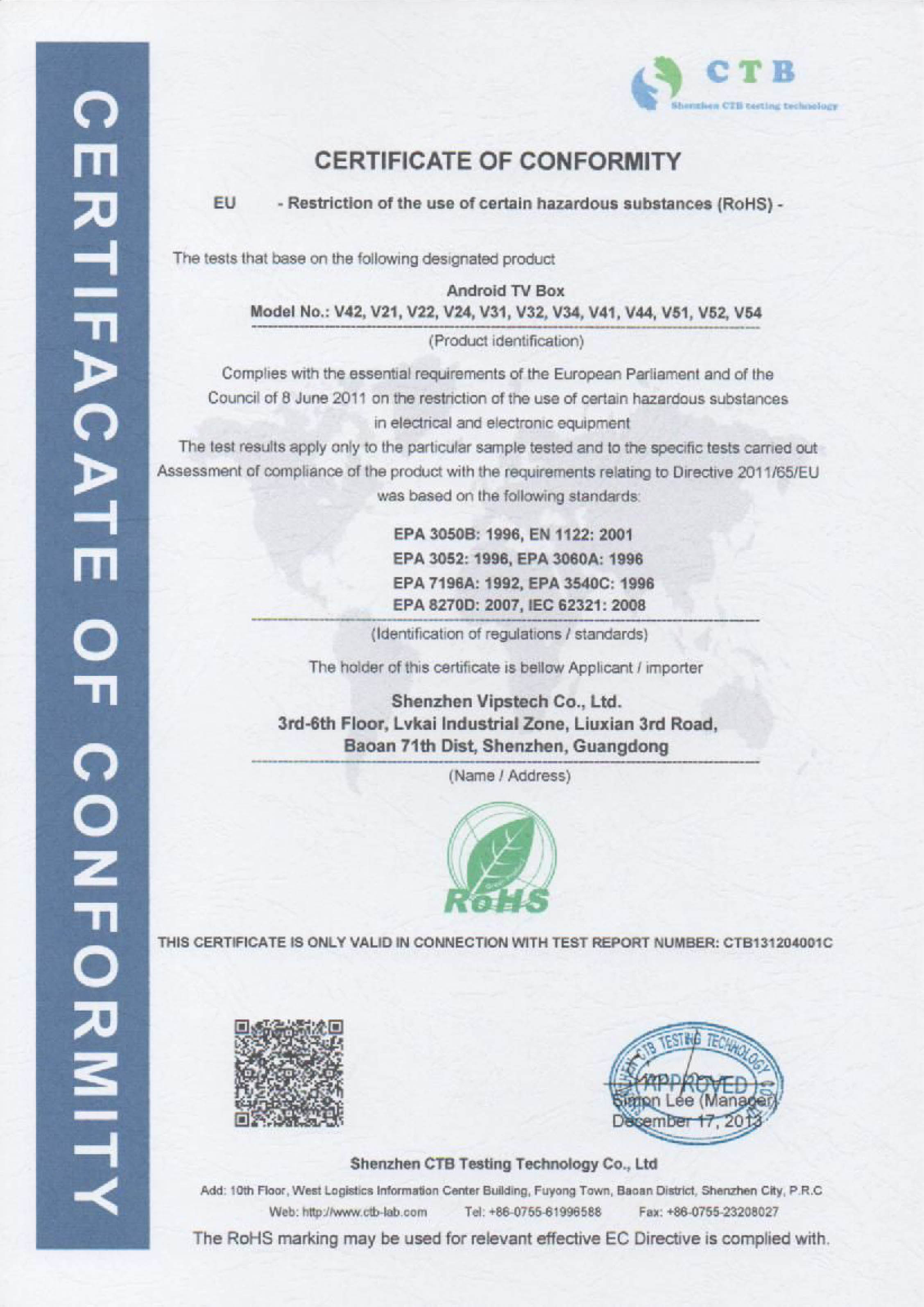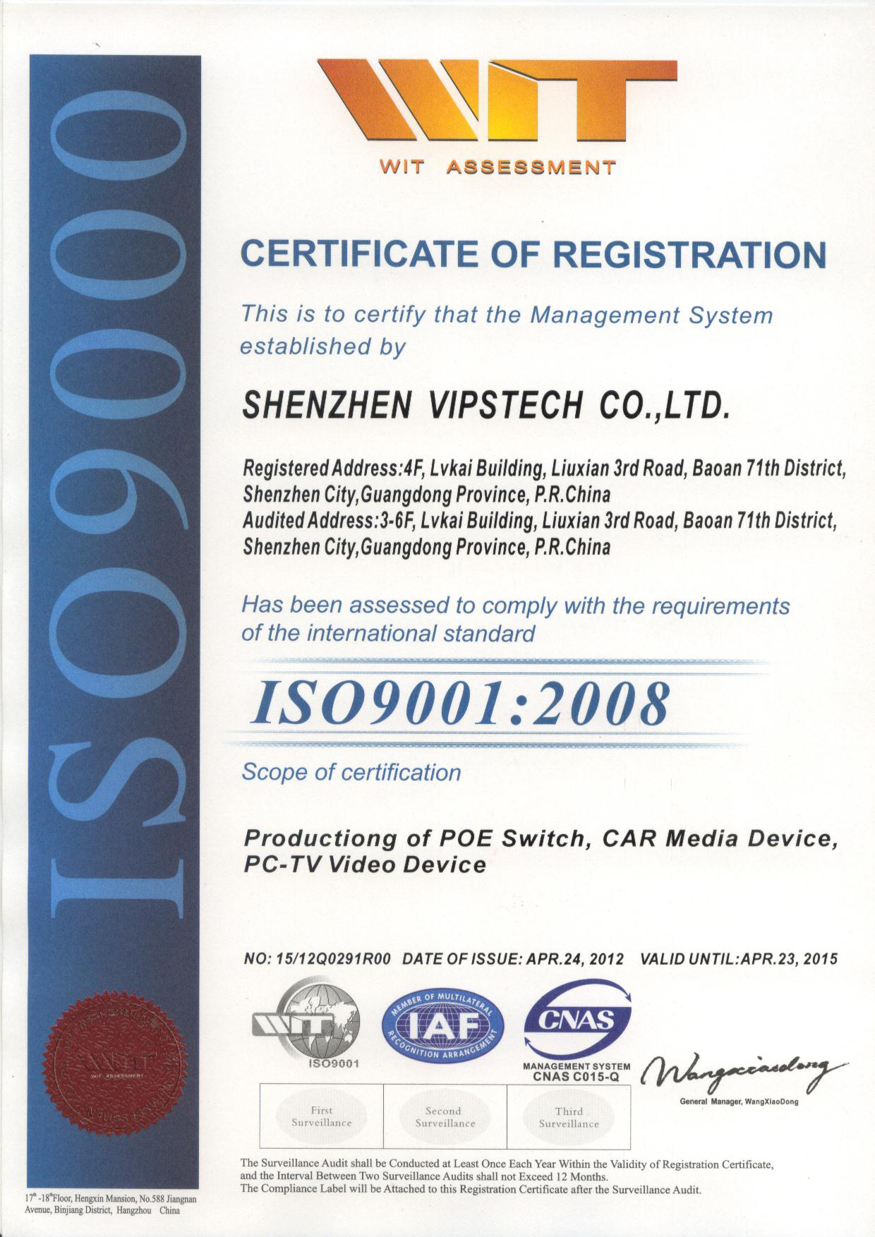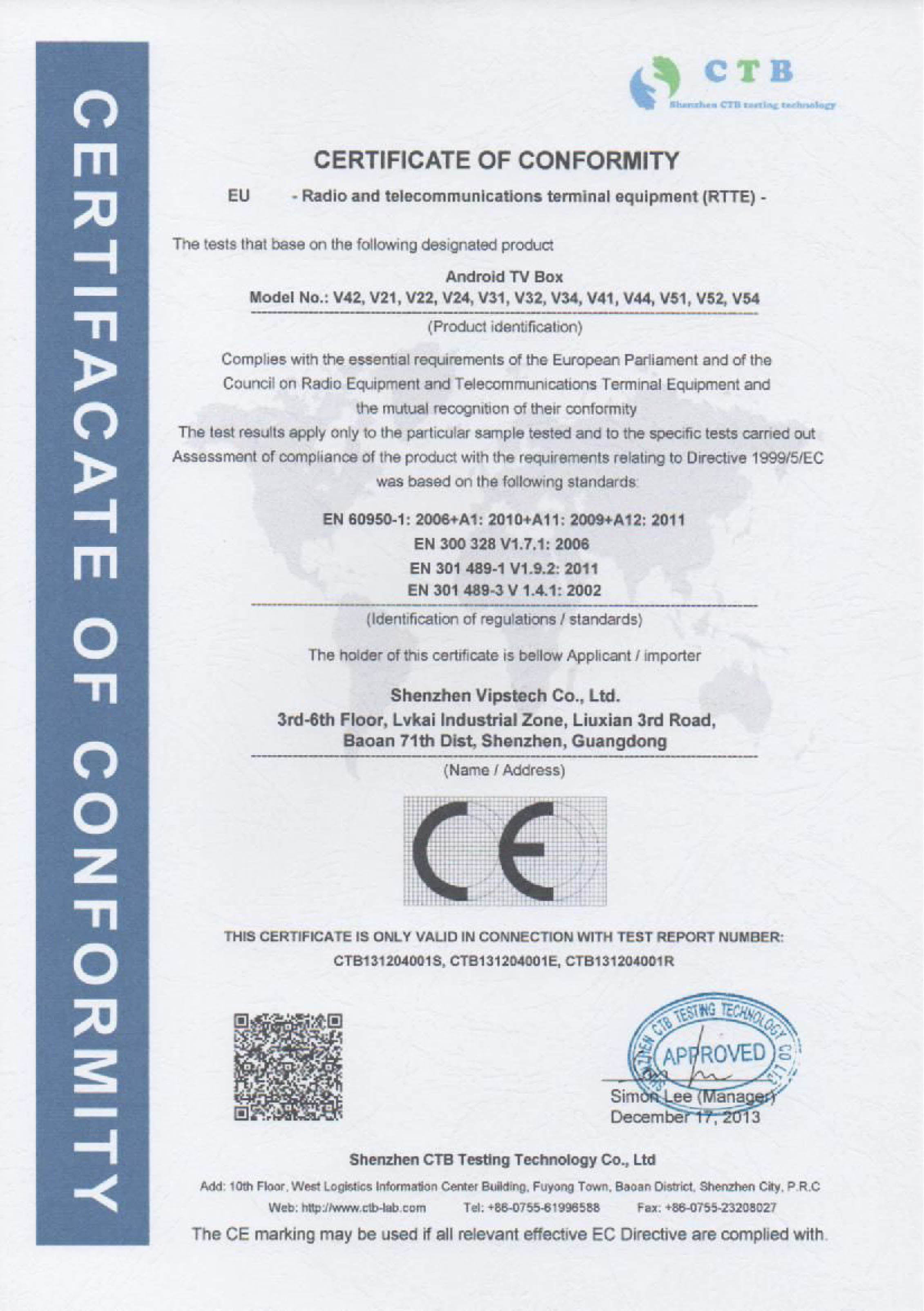Shenzhen Vipstech Co., Ltd passed ISO 9001 in 2008, and we also passed BV certificate(the report NO.: 10130850844). The products have passed CE, FCC and RoHS certificates.