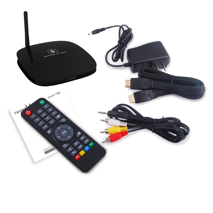 Quad Core Media Player VM64AS, ABS case with oil painting, HD vision, connecting the TV with AV/HDMI, Receiving the WIFI signal to connect internet, External antenna, Support local playback and various APK installed, 5V 1500mA power, the memory and storage can be modernized. Support 4K*2K H.264,4K*2K H.265 and more format of video, audio and picture, even 3D game.
